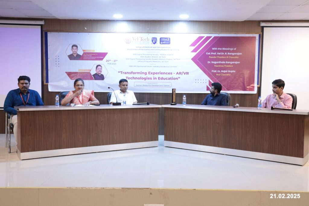 Dr. R. Senthilnathan, Professor and Head of the Centre for Immersive Technologies at SRM Institute of Science and Technology, participated in a panel discussion as part of the IEEE SPS Sponsored Forum: Industry-Academia Conclave on “Transforming Experiences – AR/VR Technologies in Education,” organized by the Department of Electronics and Communication Engineering, Vel Tech Rangarajan Dr. Sagunthala R&D Institute of Science and Technology, Avadi, Chennai.