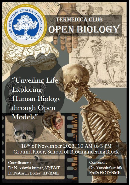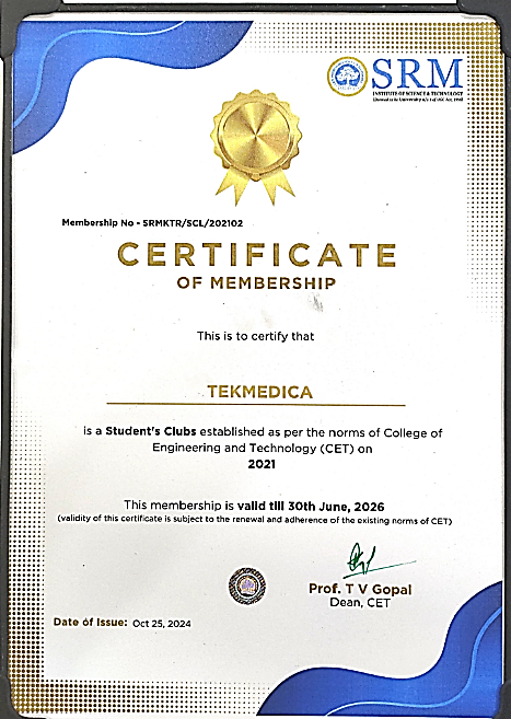 Established in 2021, TEKMEDICA is the core club for Biomedical Engineering students at SRMIST, dedicated to advancing digital healthcare technologies and addressing real-world healthcare challenges. The club provides a dynamic platform for students to innovate, learn, and collaborate on developing biomedical devices and solutions. Aligned with India’s vision of a digitally empowered nation, TEKMEDICA promotes inclusivity, accessibility, and societal impact through technology-driven healthcare initiatives. We have organized several impactful events, including guest lectures by industry experts from healthcare firms and workshops on embedded programming, Python, and healthcare innovation have equipped students with hands-on experience and practical skills.