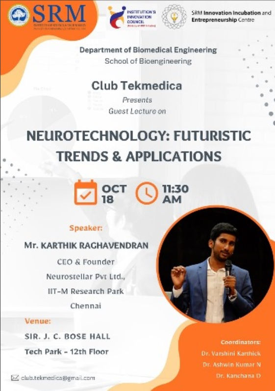 Mr. Karthik Raghavendran delivered an insightful lecture on the futuristic trends and applications of neurotechnology, focusing on advancements like brain-computer interfaces and neurofeedback. He highlighted the potential of neurotechnology to revolutionize mental health treatment and enhance cognitive functions.