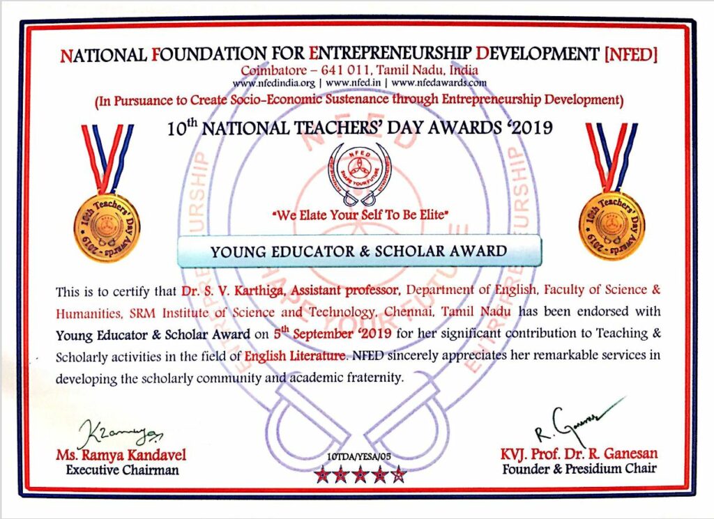 Dr. S.V. Karthiga, Assistant Professor, Department of English has been endorsed with Young Educator & Scholar Award on NFED- 10th National Teacher’s Day Award 2019.