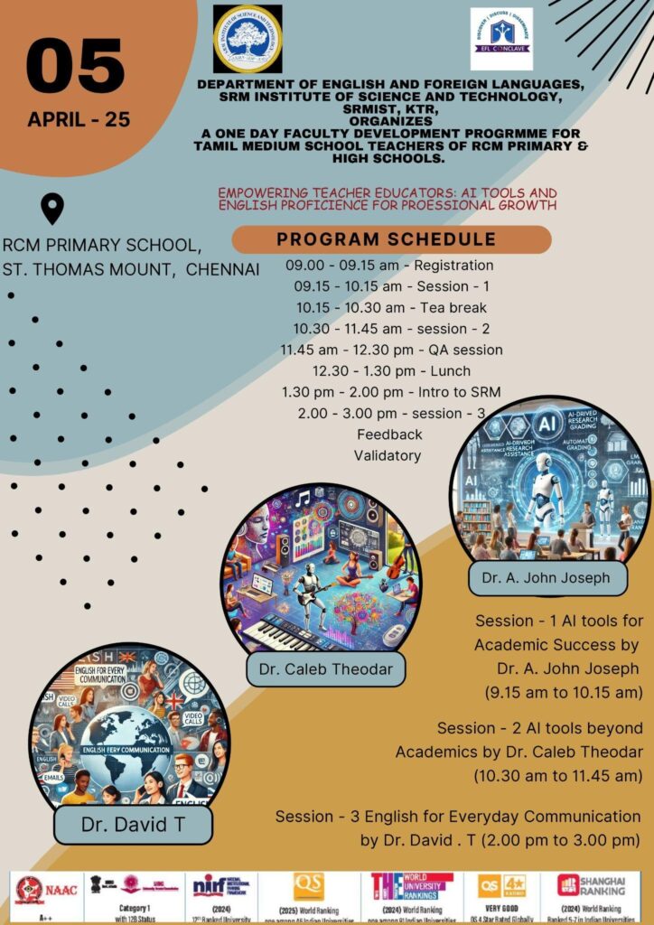 An outreach program was conducted on April 5, 2025, at RCM Primary and High School, St. Thomas Mount, Chennai, focusing on enhancing professional communication, digital literacy, and foundational AI awareness among schoolteachers. A total of 48 teachers participated in the program, aimed at empowering educators through technology-integrated language skills.
