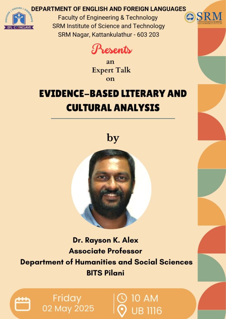 On May 2, 2025, the Department of English and Foreign Languages at the College of Engineering and Technology, SRM Institute of Science and Technology, organized an Expert Talk on Evidence-Based Literary and Cultural Analysis. The session was led by Dr. Rayson K. Alex, Associate Professor, Department of Humanities and Social Sciences, BITS Pilani. Dr. Alex discussed various research methodologies and emphasized the importance of critically examining foundational assumptions to refine and shape research ideas. He also highlighted how evidence-based approaches in literary research contribute to refining arguments and strengthening the validity of scholarly work.