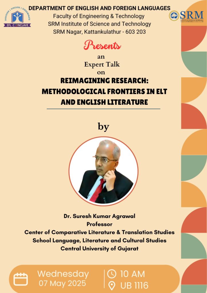 On May 7, 2025, the Department of English and Foreign Languages at the College of Engineering and Technology, SRM Institute of Science and Technology, organized an Expert Talk on Reimagining Research: Methodological Frontiers in ELT and English Literature. The session was led by Dr. Suresh Kumar Agrawal, Professor, Center of Comparative Literature and Translation Studies, School of Language, Literature, and Cultural Studies, Central University of Gujarat. Dr. Agrawal provided a compelling perspective on the role of India’s intellectual heritage in contemporary literary studies. In his talk, Dr. Agrawal emphasized the importance of re-engaging with the Indian Knowledge Systems (IKS) to enrich the research landscape in English and literary studies. He advocated for a paradigm shift that encourages scholars to draw from India’s vast repositories of classical texts, philosophical traditions, and cultural practices.