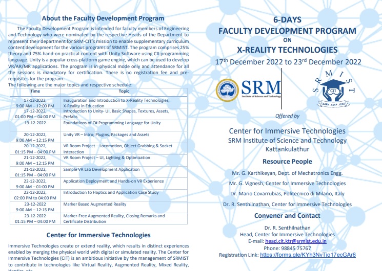 The Faculty Development Program is intended for faculty members of Engineering and Technology who were nominated by the respective Heads of the Department to represent their department for SRM-CIT’s mission to enable supplementary curriculum content development for the various programs of SRMIST. The program comprises 25% theory and 75% hand-on practical content with Unity Software using C# programming language. Unity is a popular cross-platform game engine, which can be used to develop VR/AR/MR applications. The program is in physical mode only and attendance for all the sessions is mandatory for certification. There is no registration fee and prerequisites for the program.