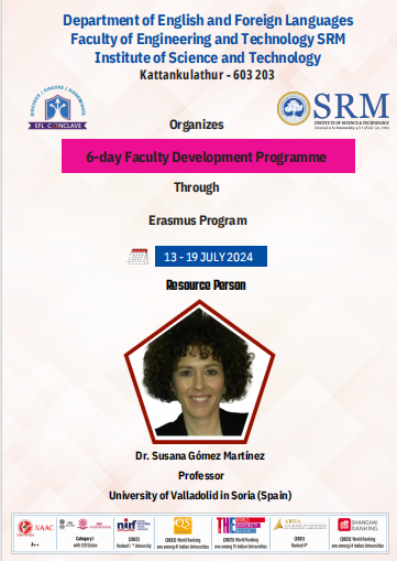 The Faculty Development Program, held from July 13 to 19, 2024, in the Department of English and Foreign Languages, featured Dr. Susana Gomez Martinez, a distinguished Professor from the University of Valladolid, Spain, as the resource person. The program began with Dr. Gomez’s insightful talk on “Best Practices in Writing Research Projects” on July 13, focusing on enhancing research quality. On July 15, she discussed cross-cultural communication with faculty, emphasizing the importance of understanding cultural differences in academic settings. The following day, she explored the impact of AI on education, highlighting its transformative role and attended a special yoga session by Dr. Sudhan.