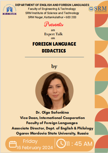 Dr. Olga Safonkina, Vice Dean, International Cooperation, Faculty of Foreign Languages Associate Director, Dept. of English & Philology, Ogarev Mordovia State University, Russia, gave an expert talk on the topic “Foreign Language Didactics” on February 16, 2024, in University Building Room no 1101. . She focused on how students are afraid of learning a new language due to the fear of failure. To make them feel confident with learning a new language, the speaker spoke with the young researchers on how to overcome this fear and make them feel confident learning a new language. The highlights of the talk include Foreign Language Didactics, Lev Vygotsky: Sociocultural Theory of Cognitive Development, and Cognitive Load Theory (CLT) in Foreign Language Teaching through the Lenses of Behaviourism, Constructivism, and Connectivism in Foreign Language Teaching.