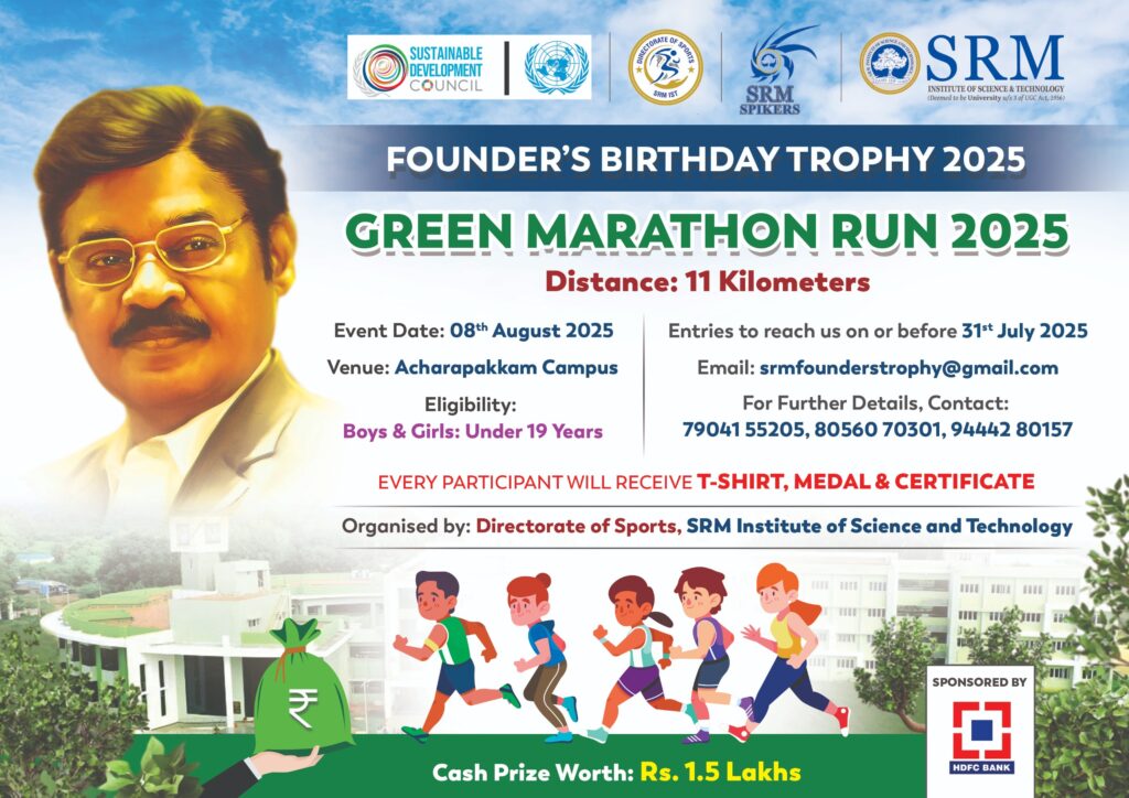 As part of the Founder’s Birthday Trophy celebrations, SRM Institute of Science and Technology (SRMIST), in collaboration with the Sustainable Development Council and the Directorate of Sports, proudly presents the Green Marathon Run 2025 – an inspiring initiative to promote youth fitness, environmental awareness, and community spirit.