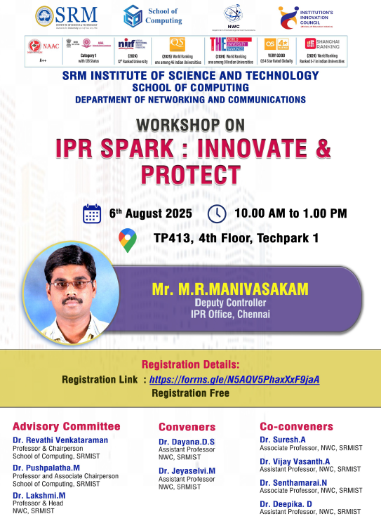 The Department of Networking and Communications is delighted to present a one-day workshop titled: “IPR Spark: Innovate & Protect”. This workshop is aimed at fostering awareness and understanding of Intellectual Property Rights (IPR), with a special focus on patent filing and grant procedures. It serves as a platform for innovators to gain insights into the legal and procedural aspects of protecting their inventions.