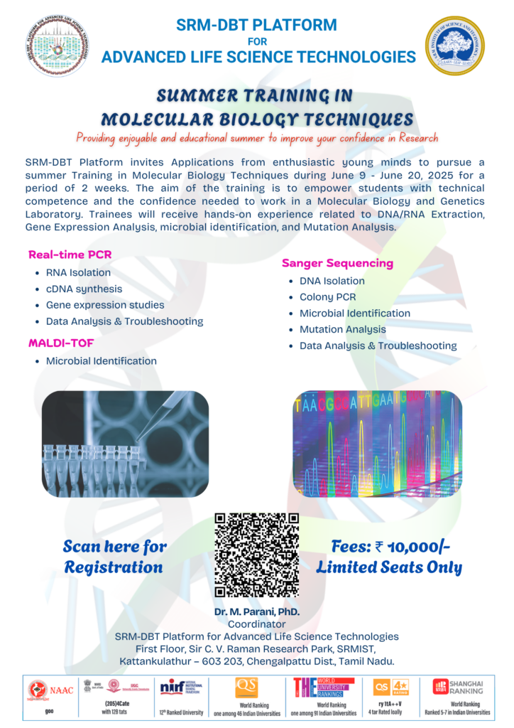 The training will be held at the SRM-DBT Platform, Sir C. V. Raman Research Park, SRMIST, Kattankulathur, Tamil Nadu. The registration fee is ₹10,000, and seats are limited. Interested students can scan the QR code on the official poster to register. For more information, please contact Dr. M. Parani, PhD, Coordinator.