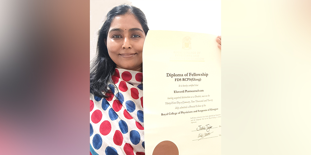 Dr. Elavenil, a distinguished Reader in the Department of Oral and Maxillofacial Surgery at SRM Dental College in Ramapuram, was honored with the prestigious Fellowship FDS RCPS (Glasgow) by The Royal College of Physicians and Surgeons of Glasgow. This esteemed Fellowship was awarded for the year 2020-2021.