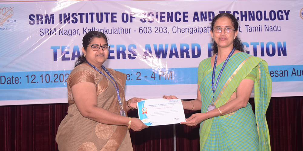 Dr. R I Minu for receiving the Teachers Award from SRM Institute of Science and Technology (SRMIST) for the academic year 2021-2022 for receiving Rashtriya Shikshak Samman Samaroh. This award is a well-deserved recognition of Dr. Minu’s exceptional contributions and dedication in the Department of Computing Technologies.
