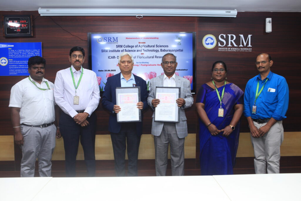 SRM College of Agricultural Sciences (SRMCAS), a constituent of SRM Institute of Science and Technology (SRMIST-KTR), signed a Memorandum of Understanding (MoU) with the ICAR – Directorate of Floricultural Research (DFR), Pune, on 25th June 2025. The MoU was formally signed by Dr. S. Ponnusamy, Registrar, SRMIST, and Dr. K.V. Prasad, Director of ICAR-DFR, at a brief ceremony marking the beginning of a five-year collaboration.