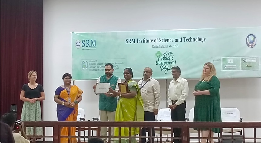 Ms. Kanimozhi Chakrapani, Assistant Professor in the Department of Horticulture and Administrator at the Urban Farm Centre, SRMIST Kattankulathur Campus, received the SRM Green Ambassador Award from the Centre of Research in Environment, Sustainability Advocacy, and Climate Change (REACH) at SRM Institute of Science and Technology, Kattankulathur. This esteemed accolade was bestowed on World Environment Day 2023 under the theme “Beat Plastic Pollution with Sustainable Solutions” on 5th June 2023.
