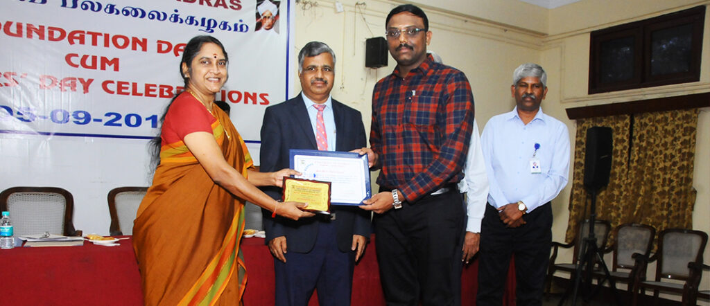 The award was conferred at the University of Madras on Teacher’s Day Celebration by The Chief Guest Prof. Sudha Seshayyan, Hon’ble Vice-Chancellor, The Tamil Nadu Dr.M.G.R. Medical University in the presence of Prof. P. Duraisamy, Hon’ble Vice-Chancellor, University of Madras.”