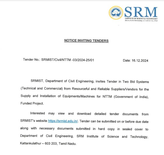 The University website as well as under the Department of Civil Engineering web link under the "Tender Notice" tab with the following tender notification “SRMIST, KTR, Civil Engineering Department invites Tender in Two Bid systems (Technical and Commercial) for the supply and installation of the equipments /machines for NTTM (GoI) funded Project. (Last Date : 01.03.2025, 02.00 pm)”.